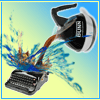 Description: Bunn coffee pot emptying onto typewriter in splash of words