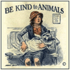 Description: vintage "Be Kind to Animals" poster with dog wrapped in blanket